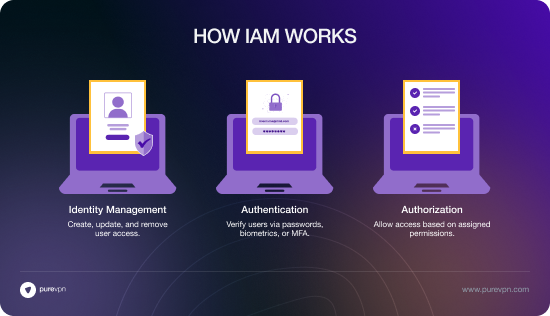 IAM is a structured set of rules, operational procedures, and utilities employed to oversee and facilitate the proper entry to an organization’s assets. Put simply, PureVPN for Team’s Identity and Access Management solution focuses on guaranteeing that only the right users can reach the right information at the right time, and for the right purposes.
